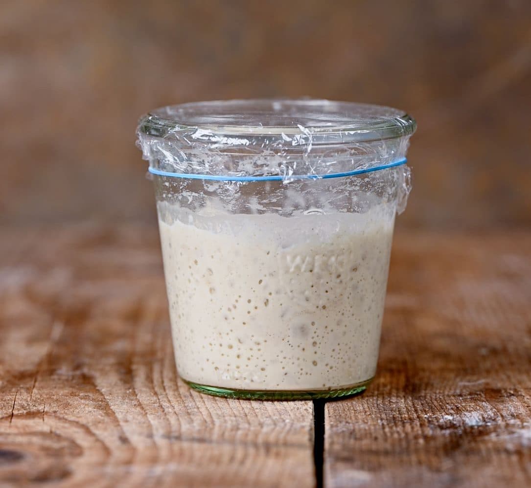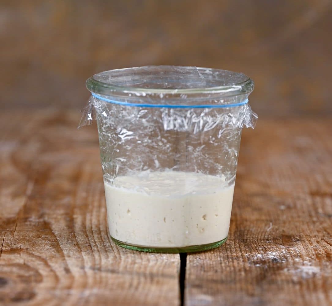 K raztopljenim drožem dodamo 20 g vode in 20 g moke ter premešamo.