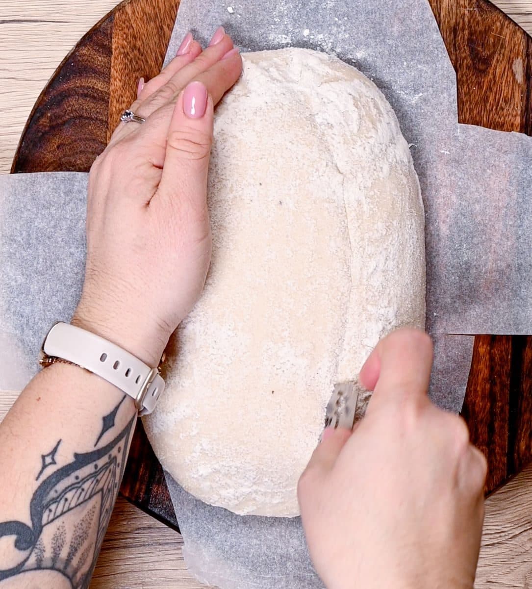 Vzhajalno košarico dvignemo, testo pa narahlo pogladimo z dlanjo.