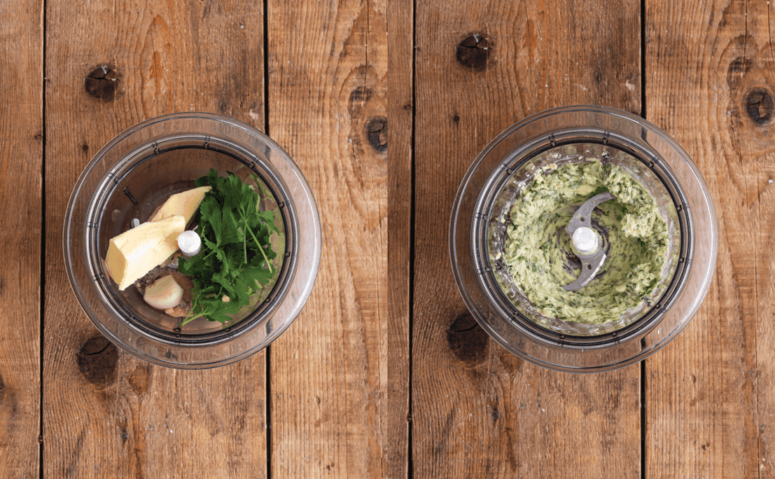 Mešamo, da se peteršilj in česen povežeta z maslom.