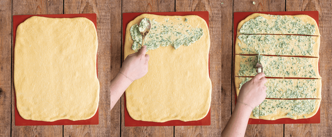 Testo razvaljamo do debeline 0,5 cm, nato ga premažemo z zeliščnim maslom.